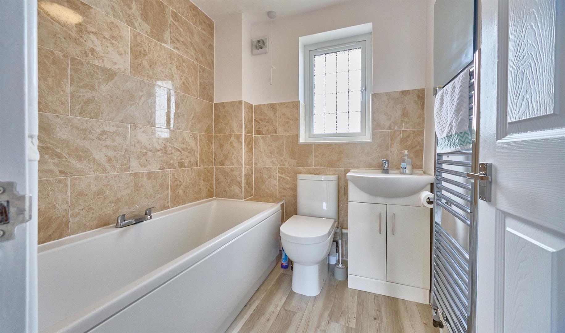 With white suite consisting of a double ended panelled bath, electric shower unit above, vanity sink unit with gloss white double cupboard beneath, low level WC. Contrasting tiled surrounds, chrome heated towel rail, extractor fan.