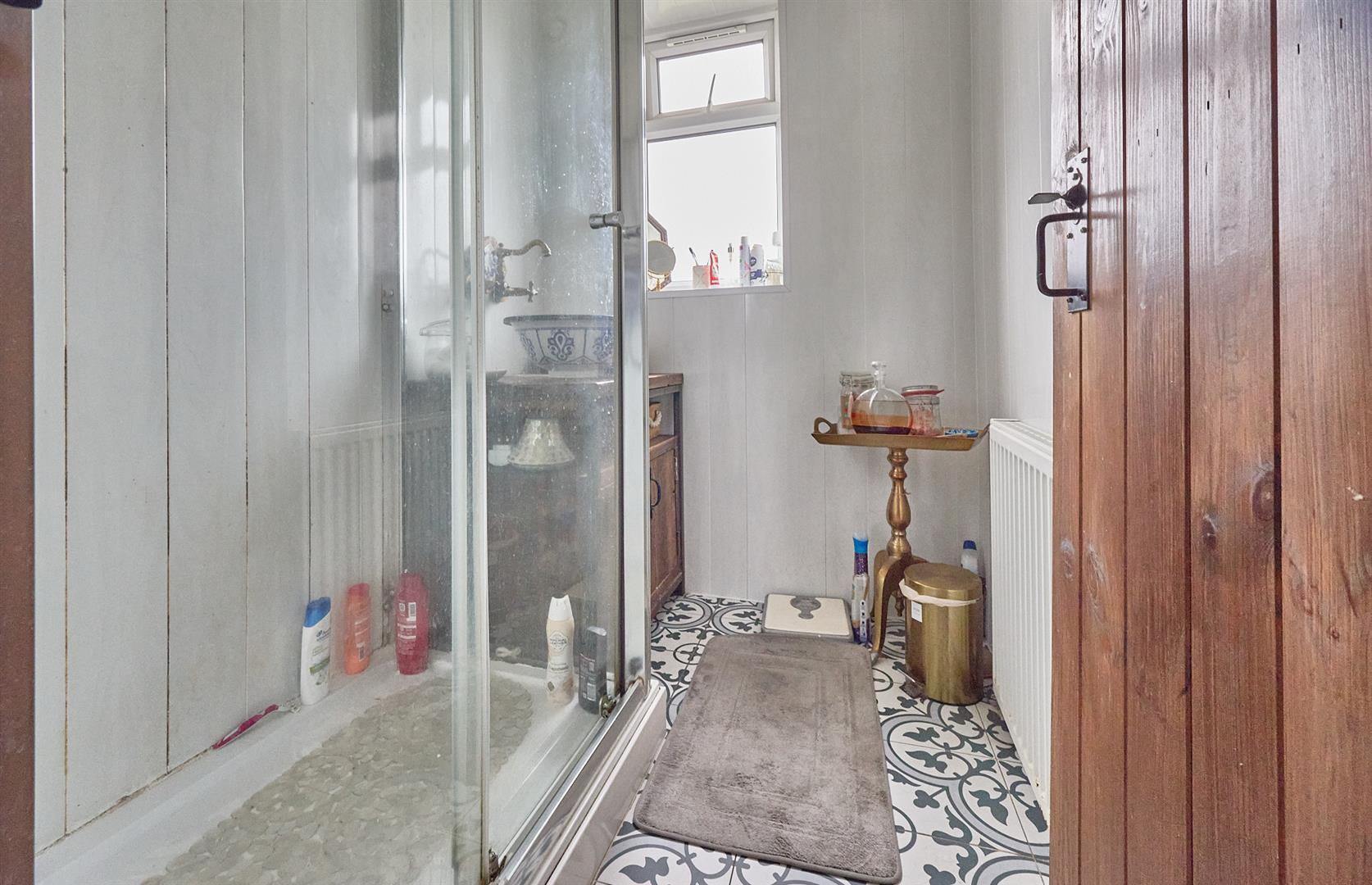 With white suite consisting of a shower cubicle with a rain shower and handheld shower above, glazed shower doors, vanity sink unit with double cupboard beneath. Contrasting white wood grain finish UPVC panelled surrounds, extractor fan and radiator.