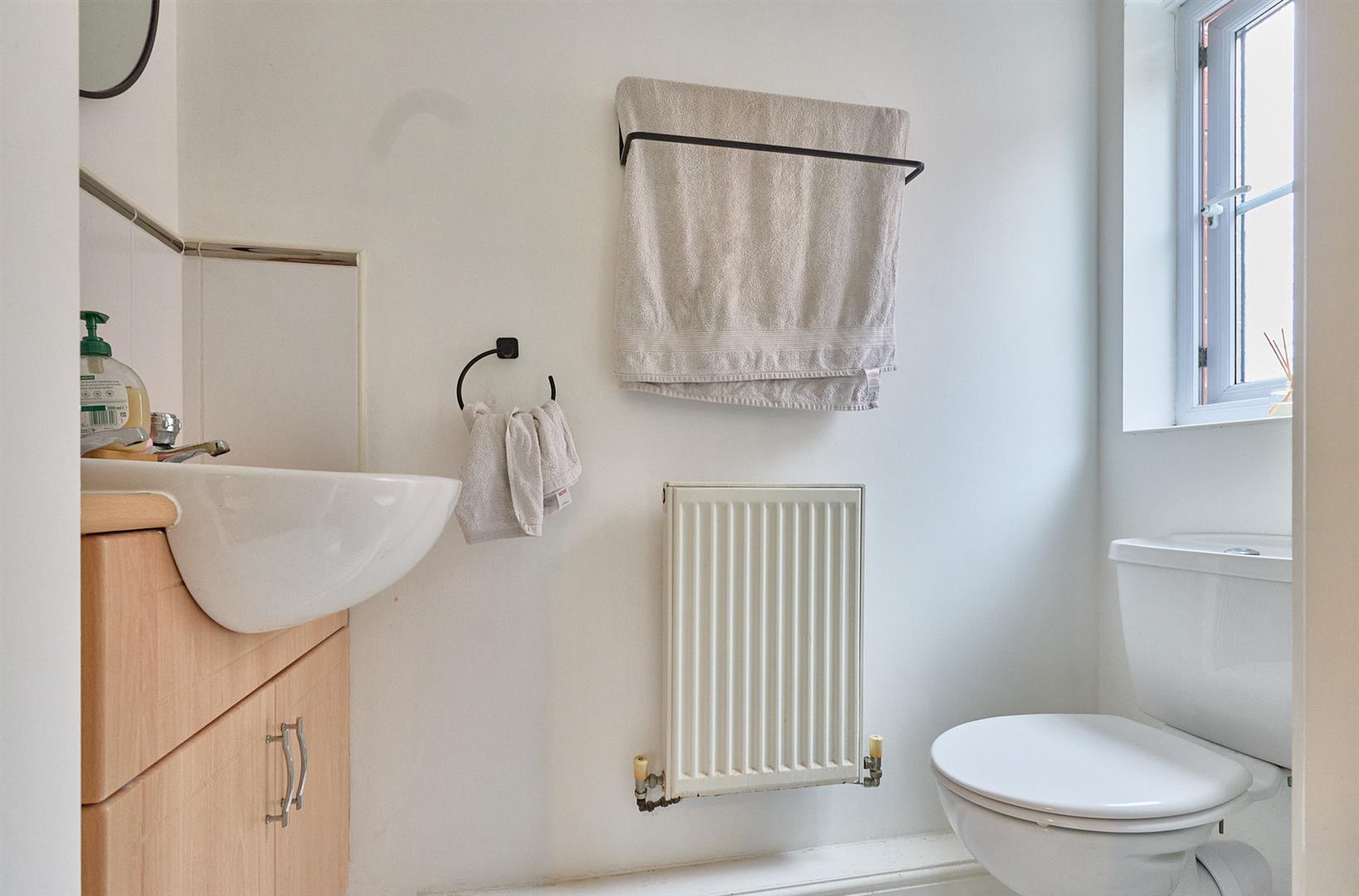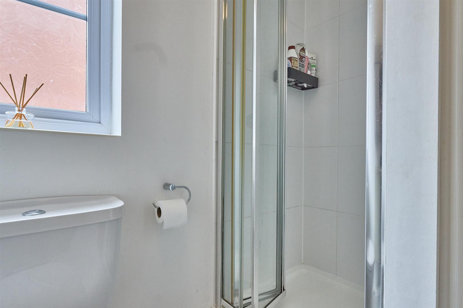 With tiled flooring, low level WC, vanity wash hand basin with storage beneath, chrome taps above, tiled splashbacks, shaver point, single panel radiator, extractor fan, shower enclosure with bar shower.
