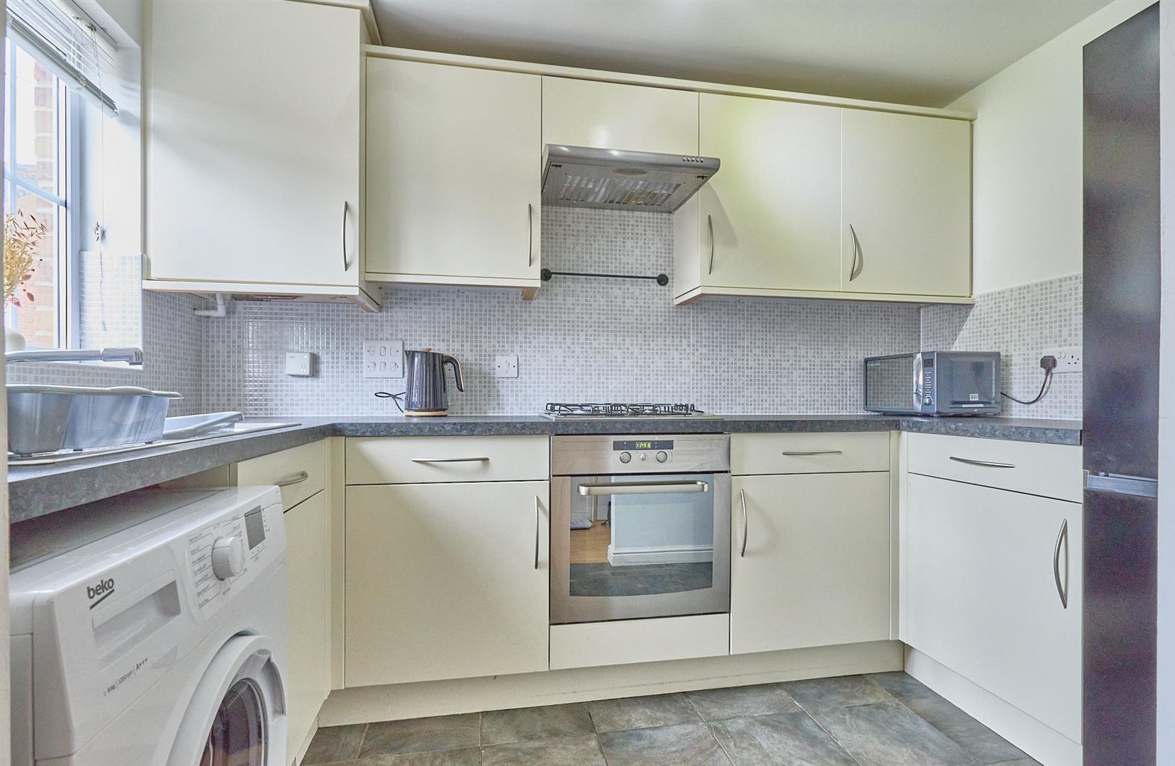 With tiled flooring, a range of floor standing kitchen cupboard units with brushed chrome handles, granite effect working surfaces, stainless steel drainer sink with chrome mixer tap, built in Whirlpool oven, four ring gas hob and extractor above. Further matching rang of wall cupboard units one housing the Glow worm boiler for domestic hot water and gas central heating, tiled splashbacks, recess and plumbing for washing machine, recess for fridge freezer.