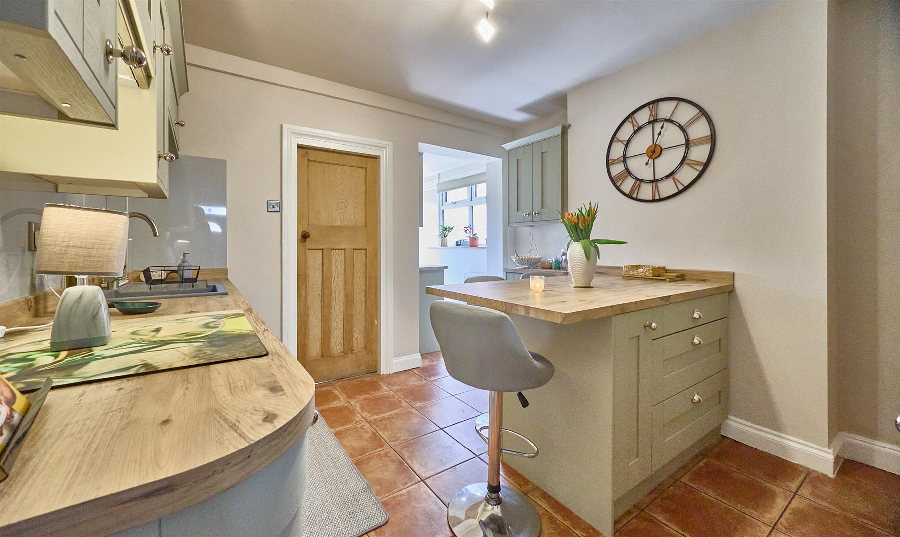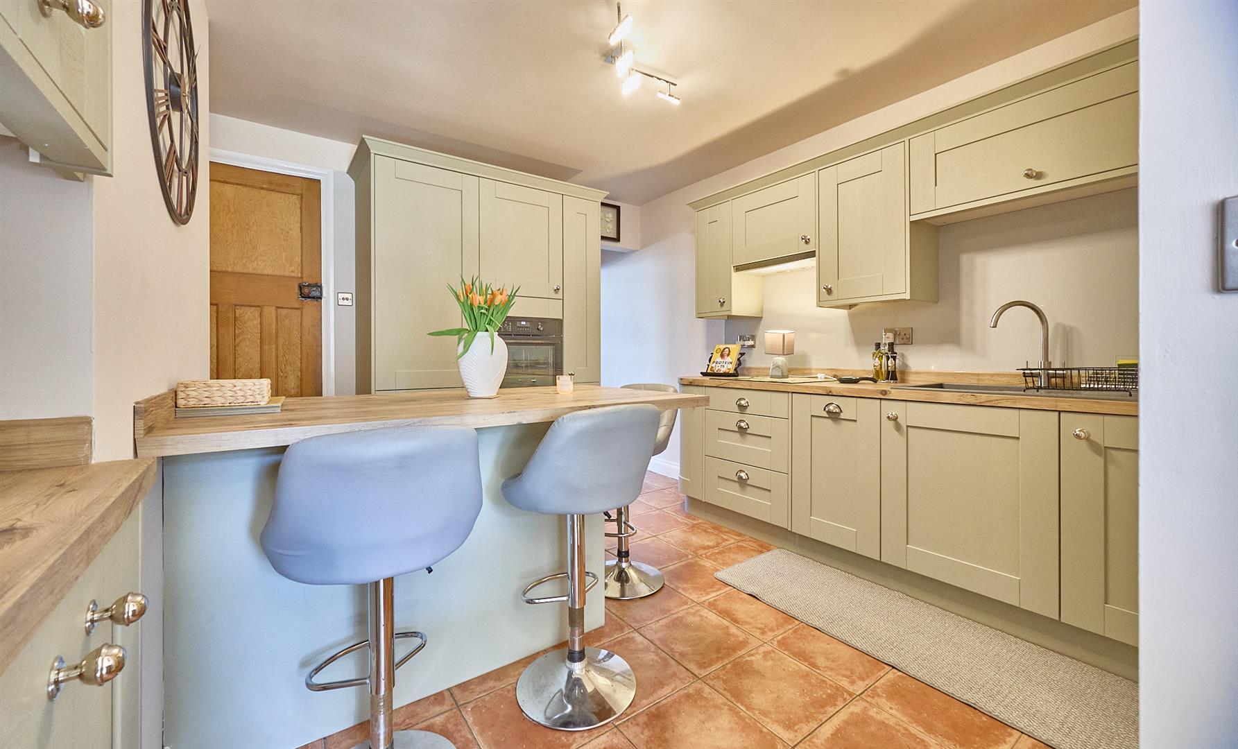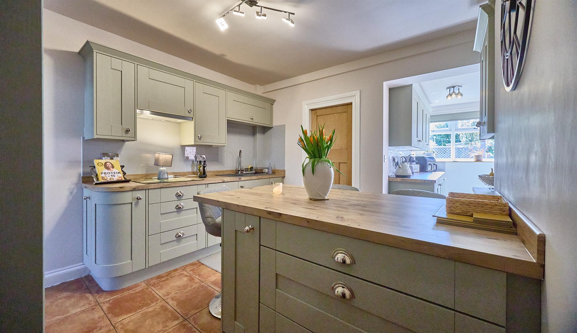 With a fashionable range of sage green fitted kitchen units with soft close doors consisting inset single drainer resin sink unit, chrome mixer taps above, cupboard beneath. Further matching range of floor mounted cupboard units and three drawer unit, contrasting oak wood grain working surfaces above with inset four ring induction hob unit, integrated extractor hood above. Matching upstands, further matching range of wall mounted cupboard units and one tall pull out larder unit. Further integrated appliances include a single fan assisted oven with grill and dishwasher. There is also a central island breakfast bar with oak finish with three drawer unit and cupboard beneath. Terracotta tiled flooring, gas kick panel heater. Door and stairway to first floor. Archway leads to