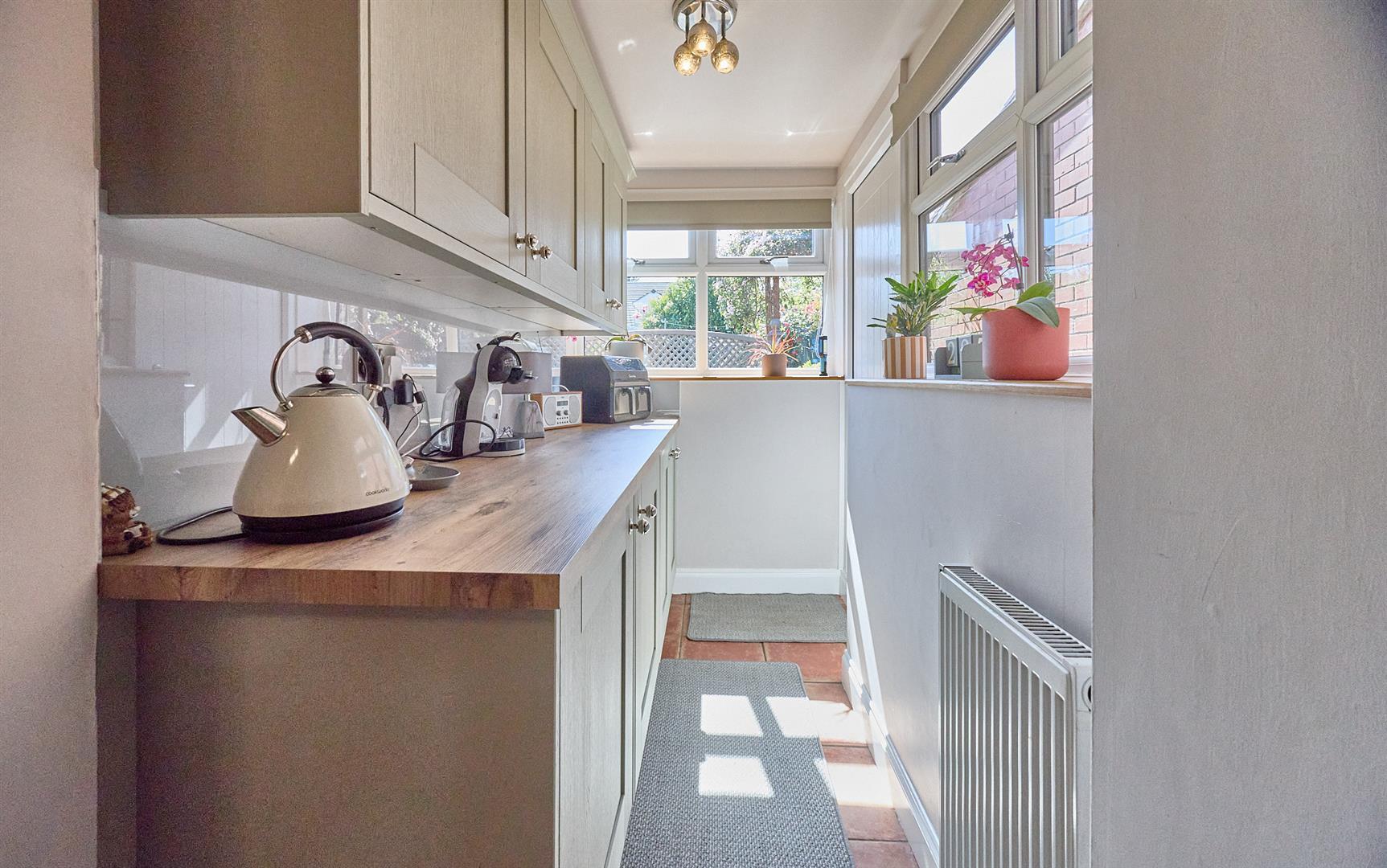 With matching units from the kitchen consisting of a oak finish working surface, cupboards beneath. Further wall mounted cupboard units, integrated washing and drying machine. Terracotta tiled flooring, radiator. Light grey composite panelled door to the side of the property.