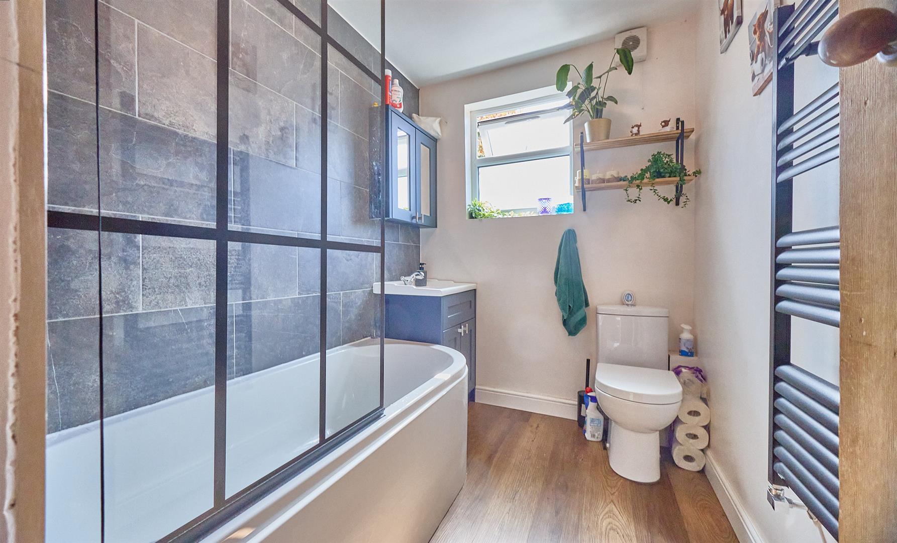 With white suite consisting of a panelled bath, black rain shower and hand held shower above, black and glazed shower screen to side, white vanity sink unit with navy double cupboard beneath, navy and mirror fronted bathroom cabinet above, low level WC. Contrasting tiled surrounds, oak finish laminate wood strip flooring, fashionable black heated towel rail and extractor fan.,